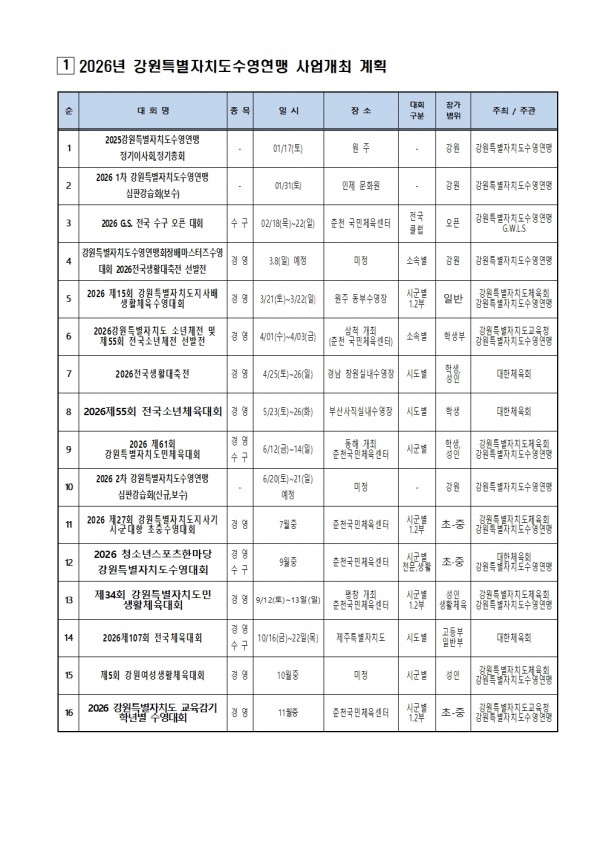 2026년 강원특별자치도수영연맹 대회 일정 페이지 정보 작성자 최고관리자 댓글 0건 조회 242회 작성일 26-01-27 10:46 본문 목록 다음글2026년도 대한수영연맹 주최 및 주관 전국수영대회 개최 현황 26.01.27